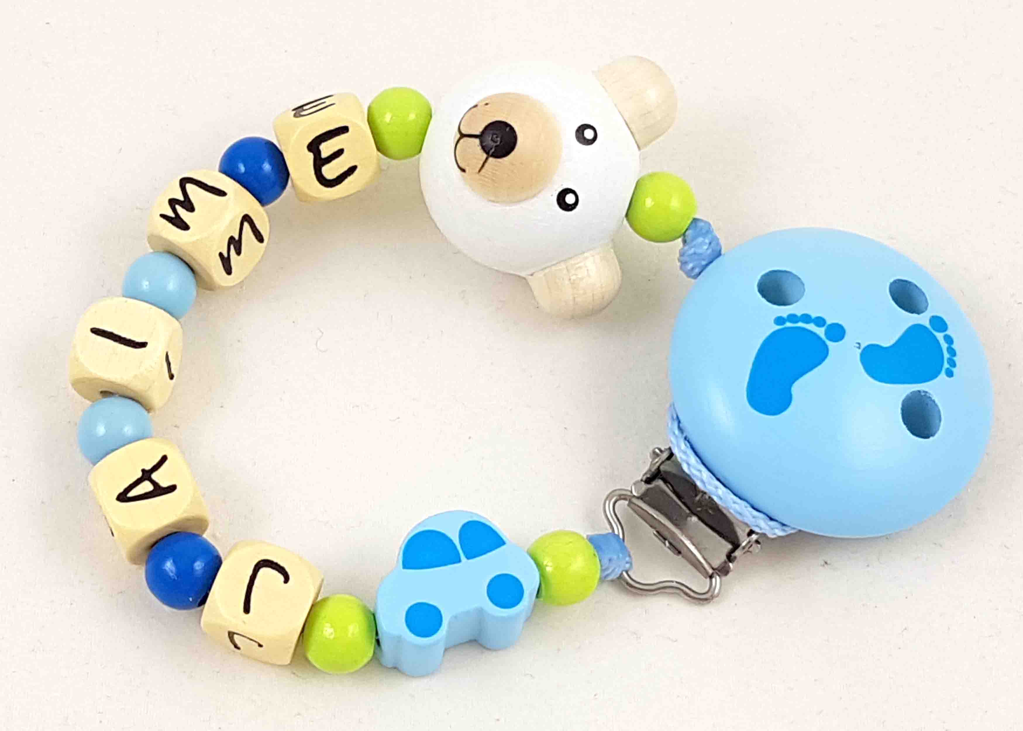 Schnullerkette mit Name "Auto&Bär" in babyblau/lemon/mittelblau