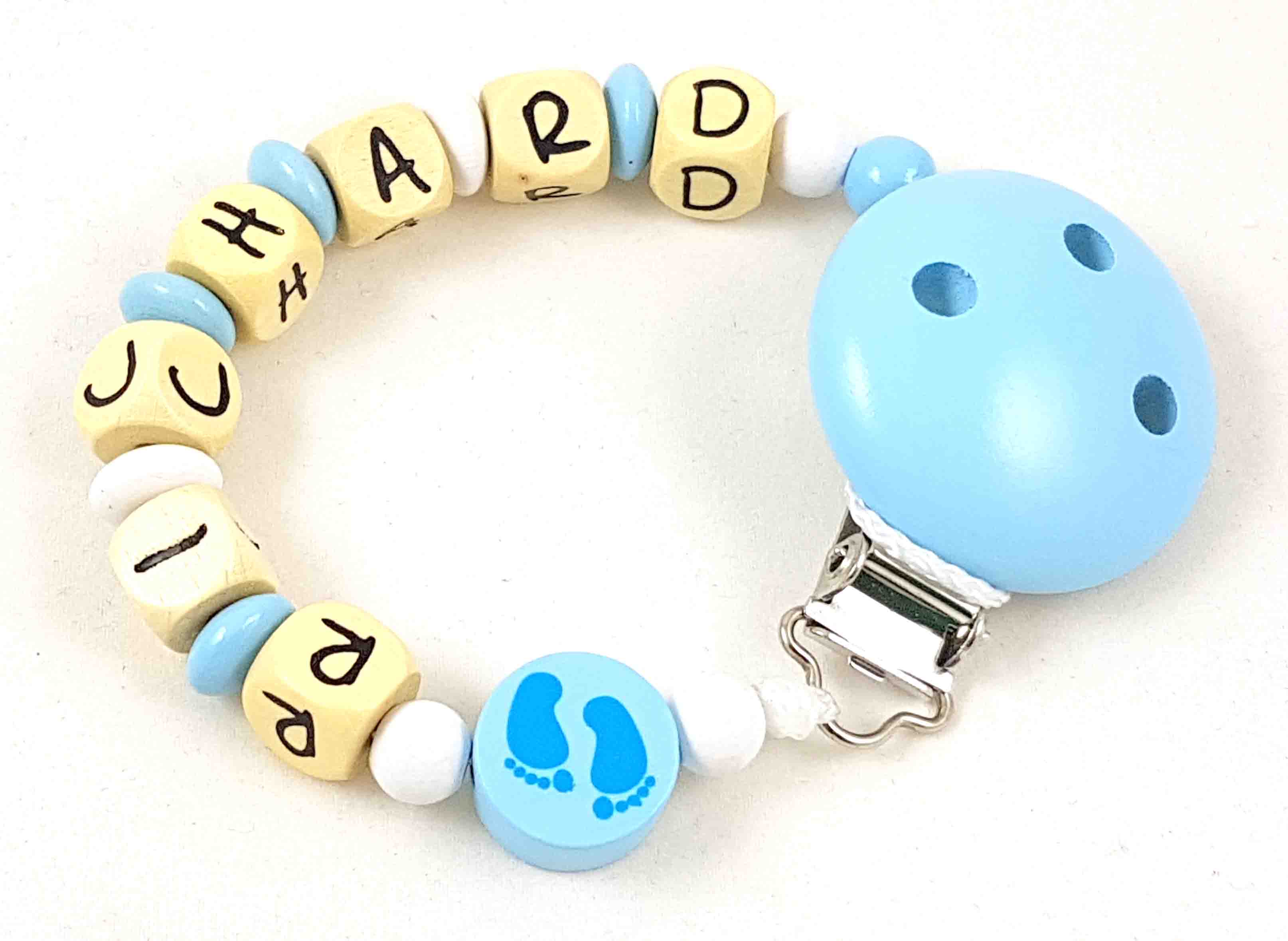 Dieses Schnullerketten-Modell wird in der Farbkombi babyblau/weiß, einer Motivperle Scheibchen Babyfüßchen und einem unifarbenen Befestigungsclip gefertigt.