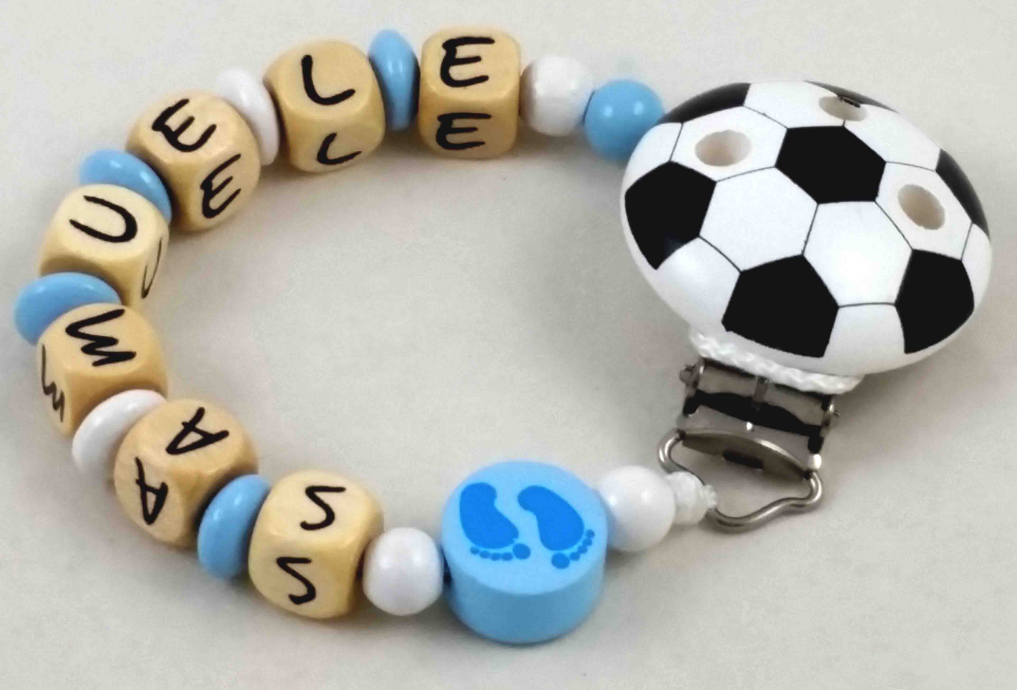 Die abgebildete Schnullerkette besteht aus einer belastbaren PP-Schnur, einem nickelfreien Befestigungsclip aus Holz, geprägten Holzbuchstabenwürfel und Holzperlen bzw. Holzlinsen sowie einer Motivperle aus Holz.