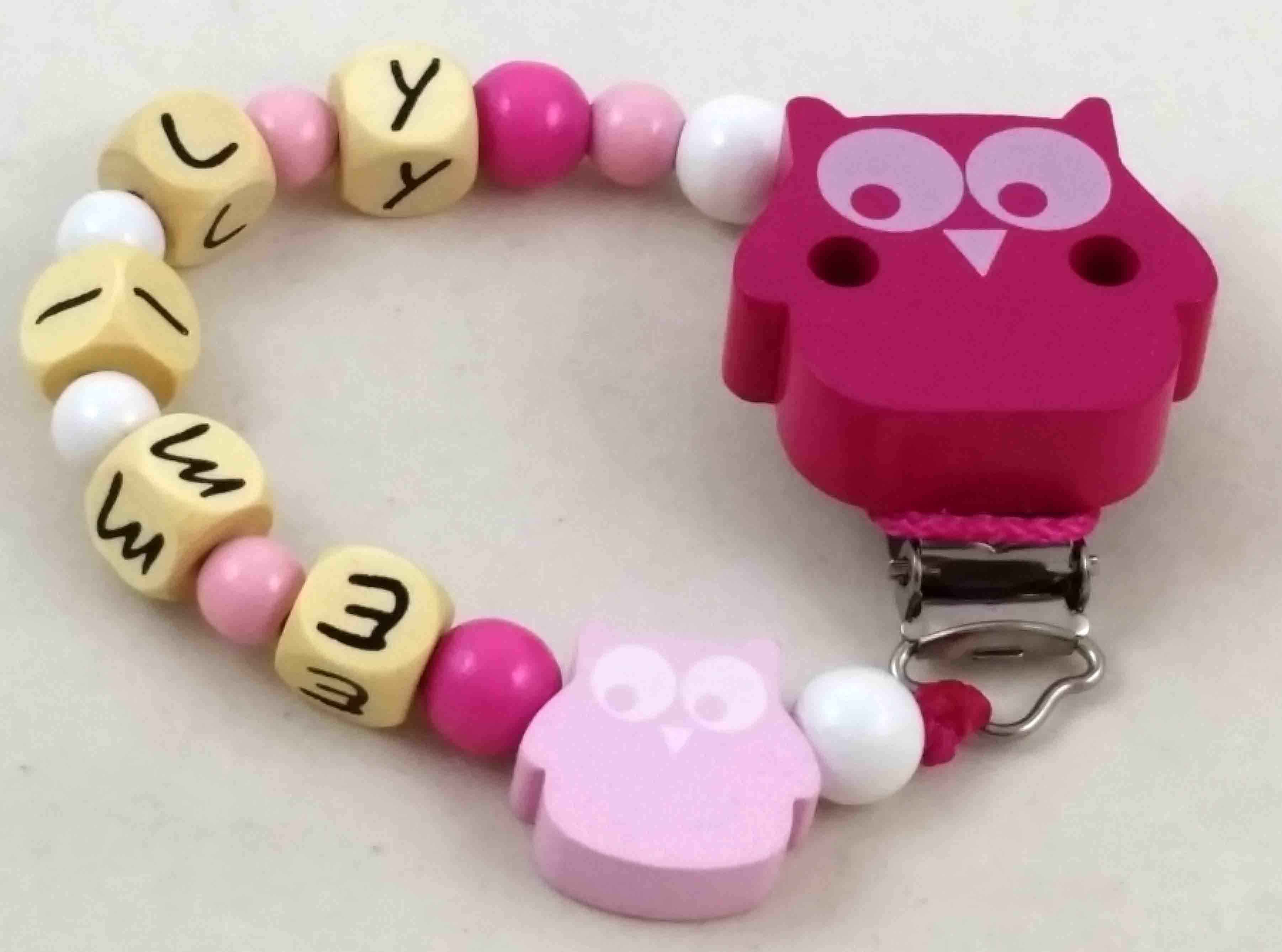 Schnullerkette mit Name "Eule" in babyrosa/pink/weiß