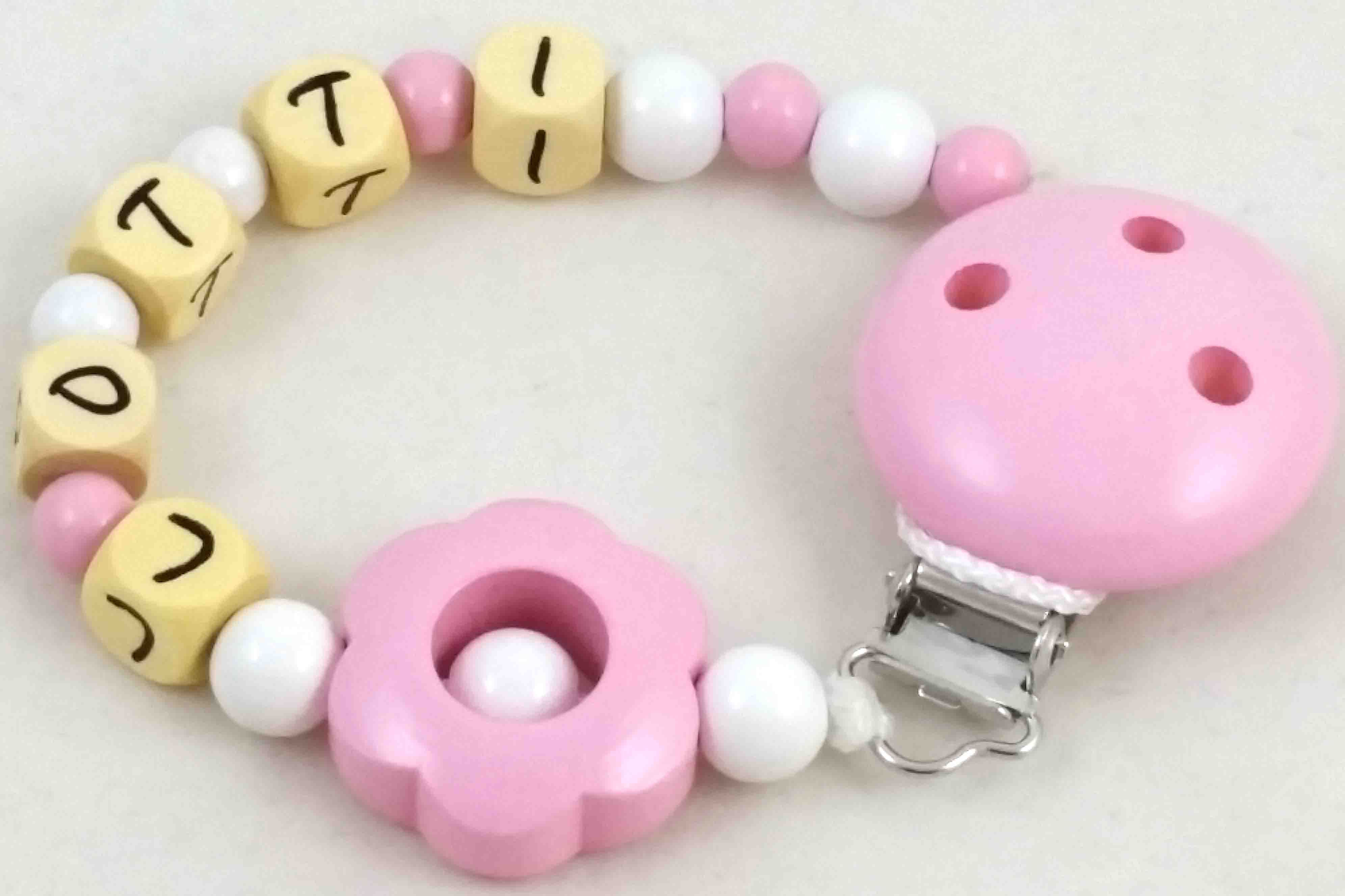 Schnullerkette mit Name "Blume" in babyrosa/weiß