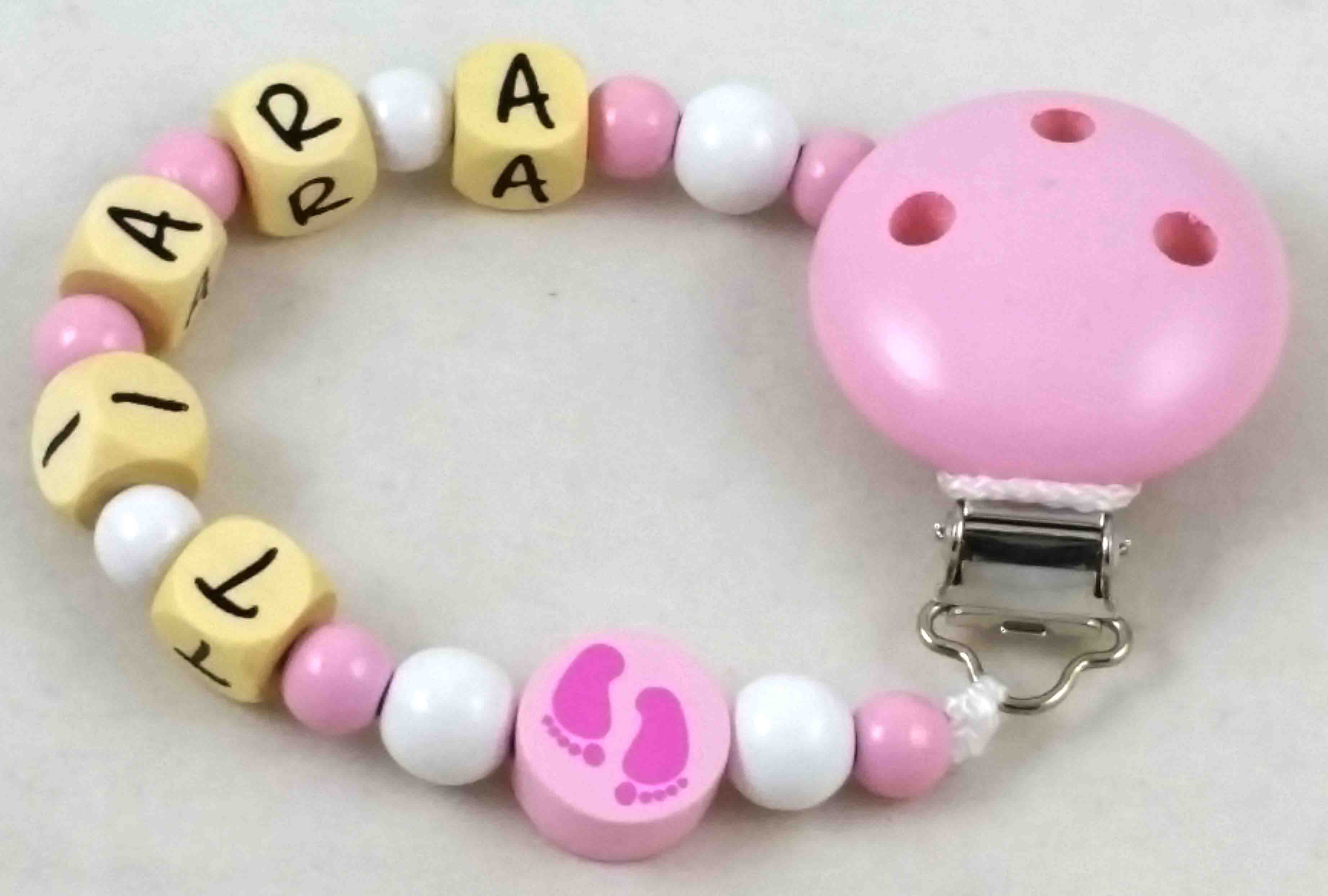 Dieses Schnullerketten-Modell wird in der Farbkombi babyrosa/weiß, einer Motivperle Scheibchen Babyfüßchen und einem unifarbenen Befestigungsclip gefertigt.