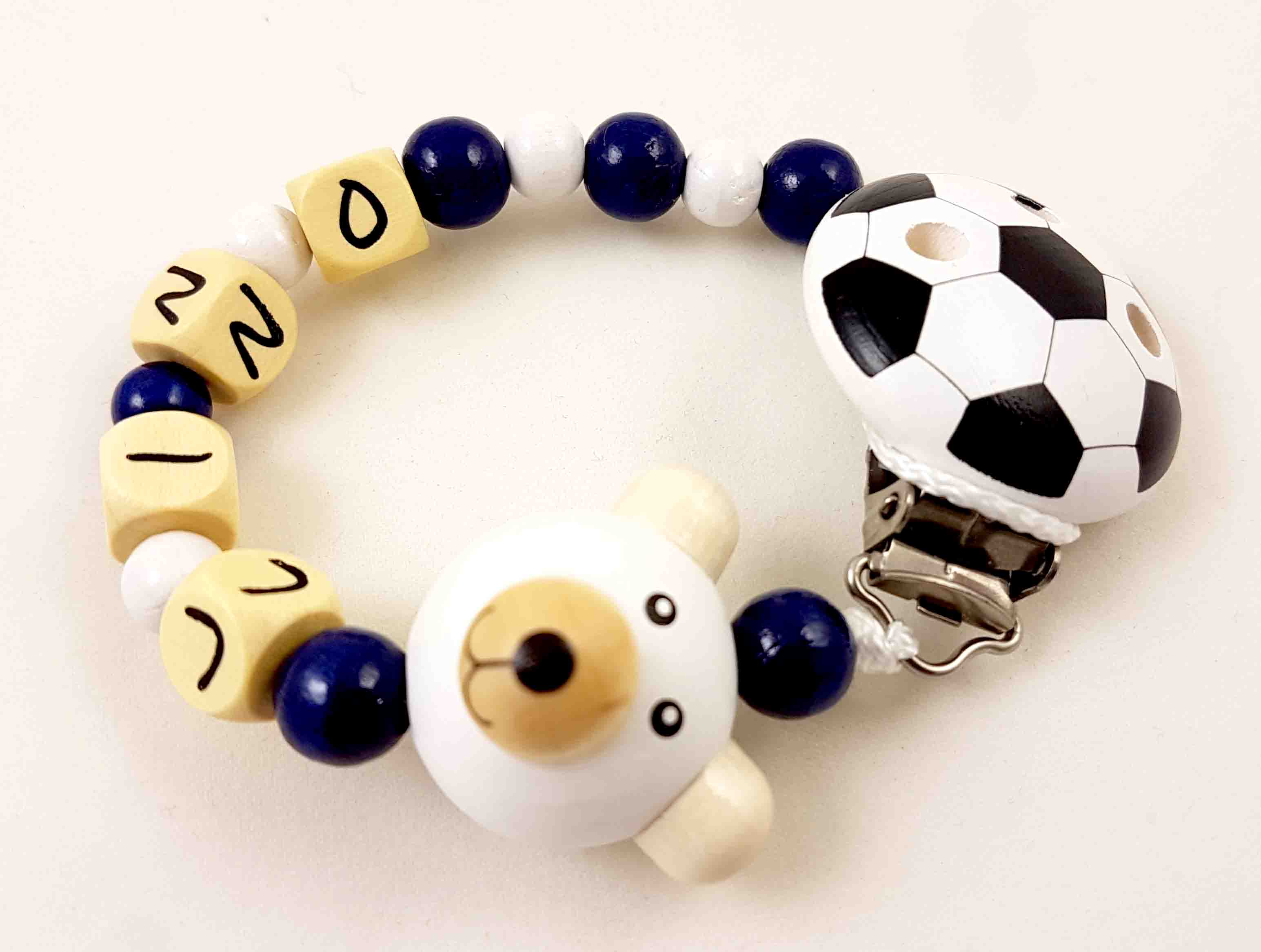 Dieses Schnullerketten-Modell wird in der Farbkombi dunkelblau/weiß, einer Motivperle 3D Bär und einem unifarbenen Befestigungsclip gefertigt.