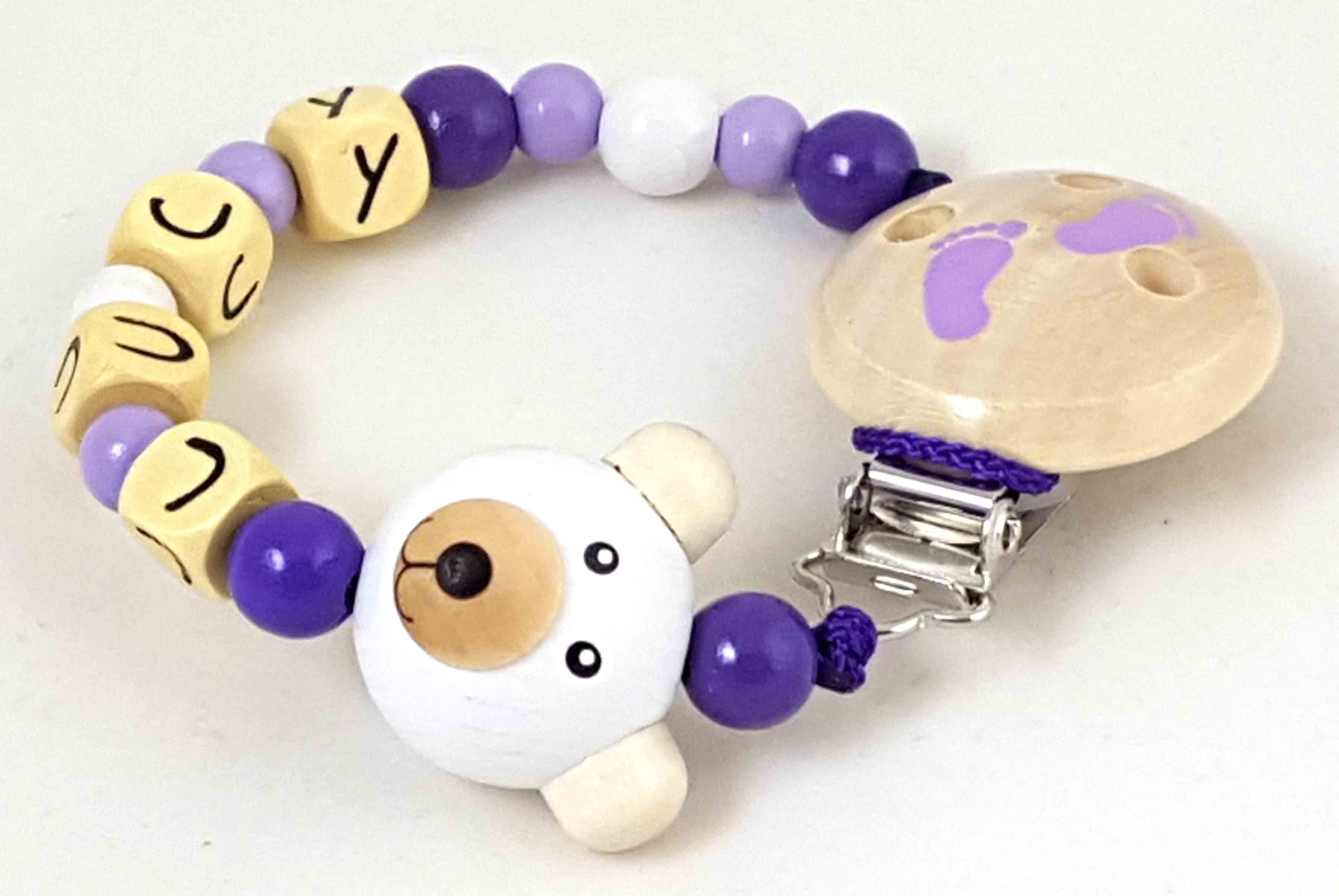 Dieses Modell wird in der Farbkombi flieder/lila/weiß, einer Motivperle 3D Bär und einem unifarbenen Befestigungsclip gefertigt.