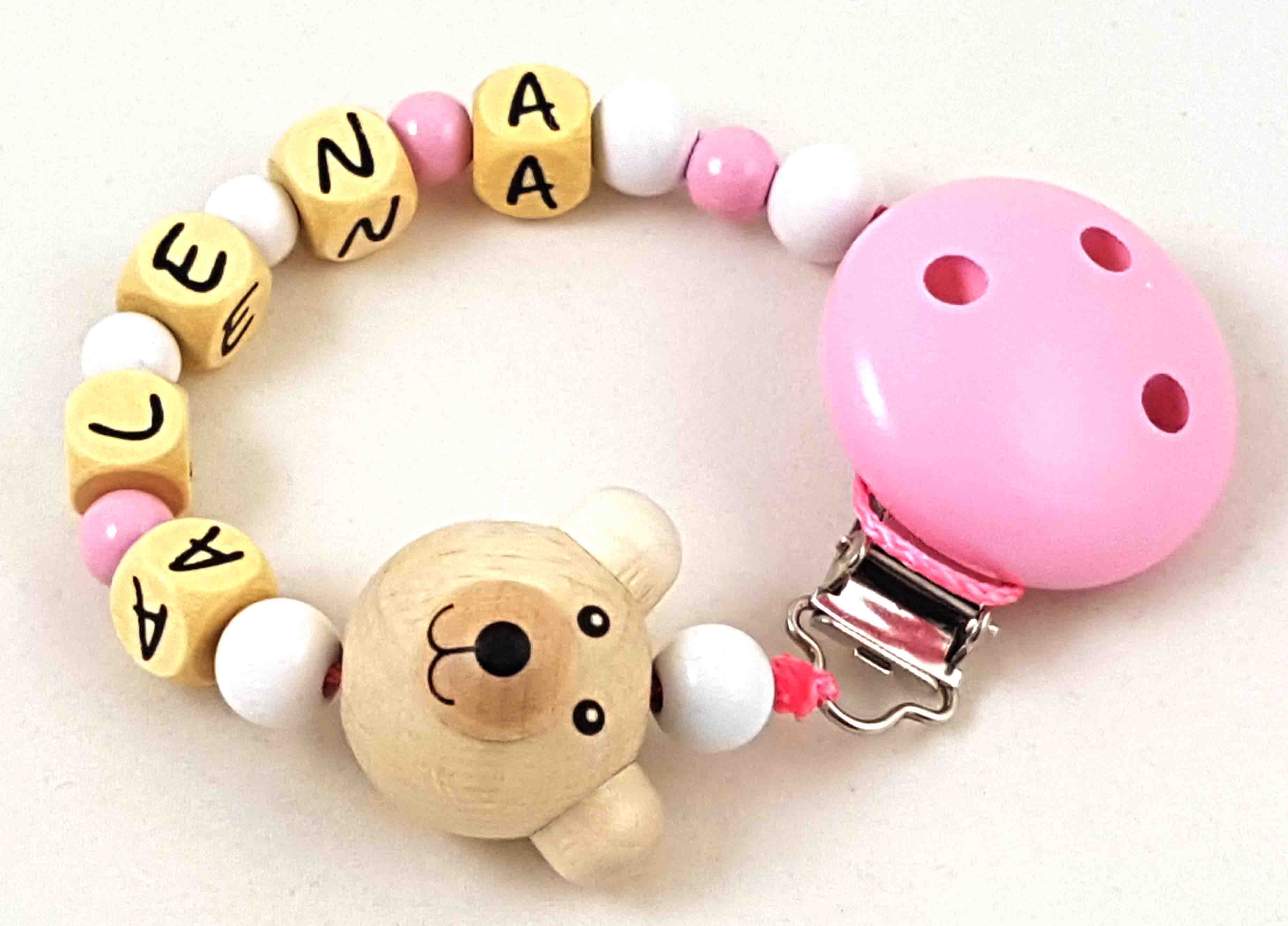 Dieses Modell wird in der Farbkombi babyrosa/weiß, einer Motivperle 3D Bär und einem unifarbenen Befestigungsclip gefertigt.