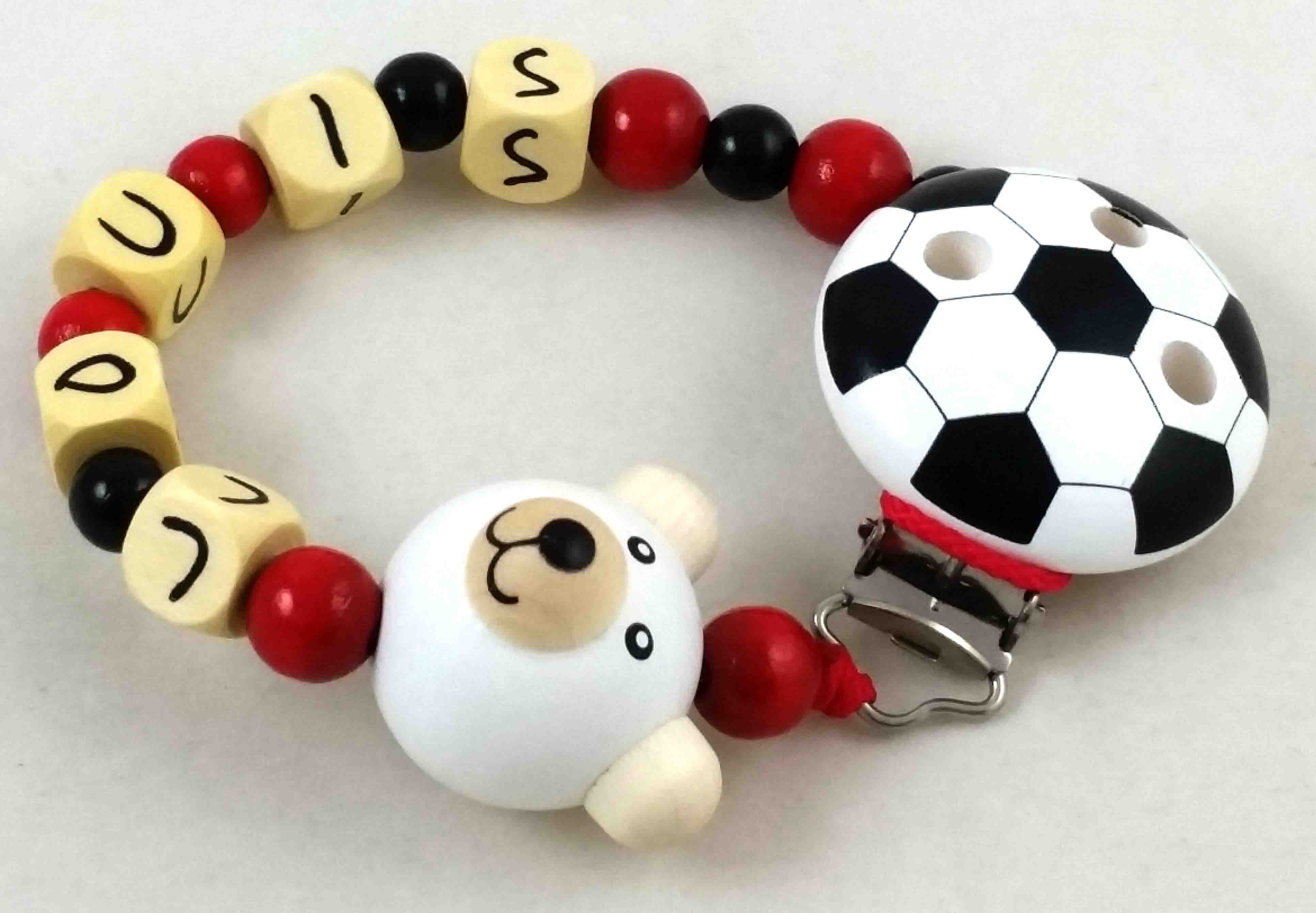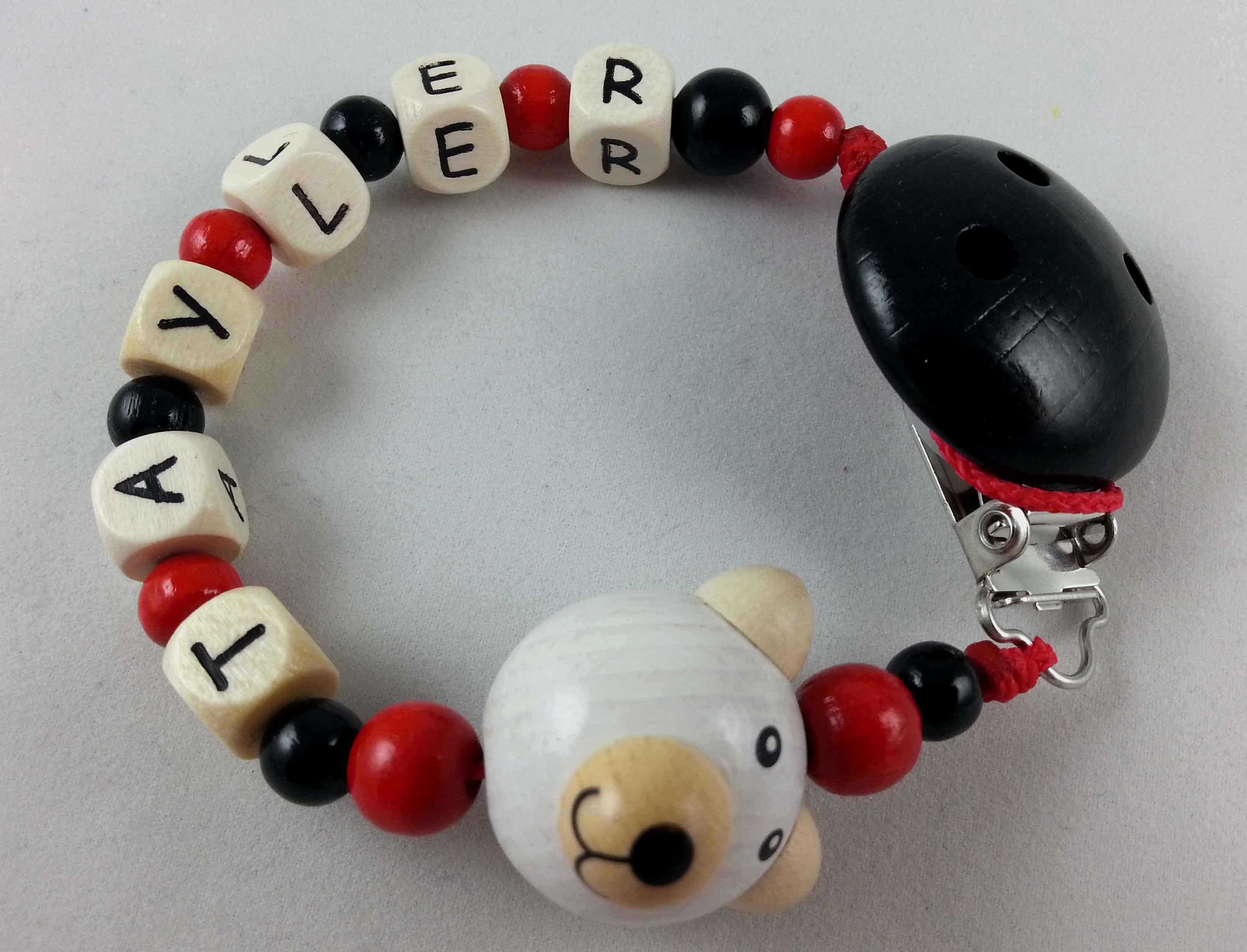 Dieses Schnullerketten-Modell wird in der Farbkombi rot/schwarz, einer Motivperle 3D Bär und einem unifarbenen Befestigungsclip gefertigt.