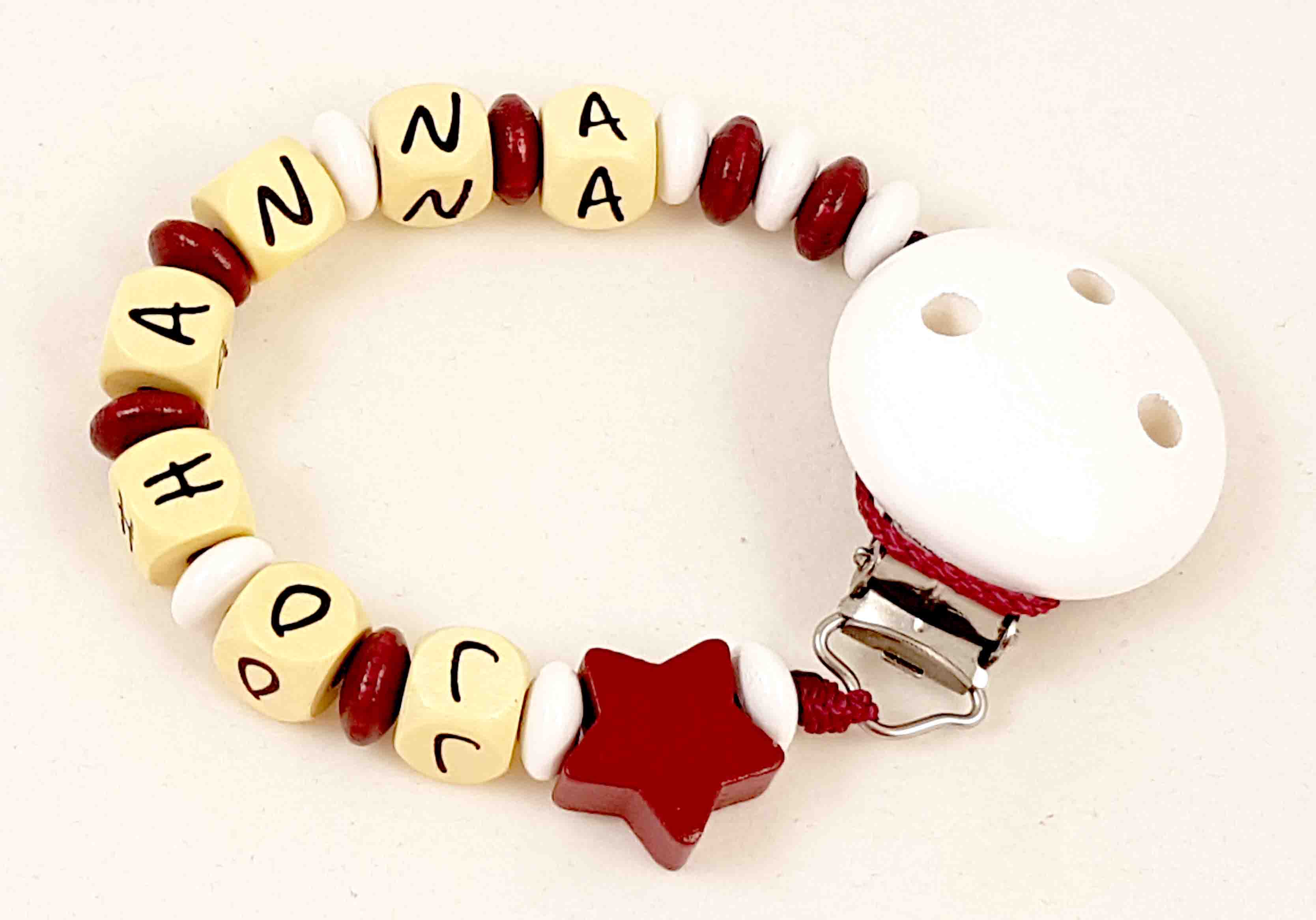 Dieses Schnullerketten-Modell wird in der Farbkombi bordeaux/weiß, einer Motivperle Stern und einem unifarbenen Befestigungsclip gefertigt.
