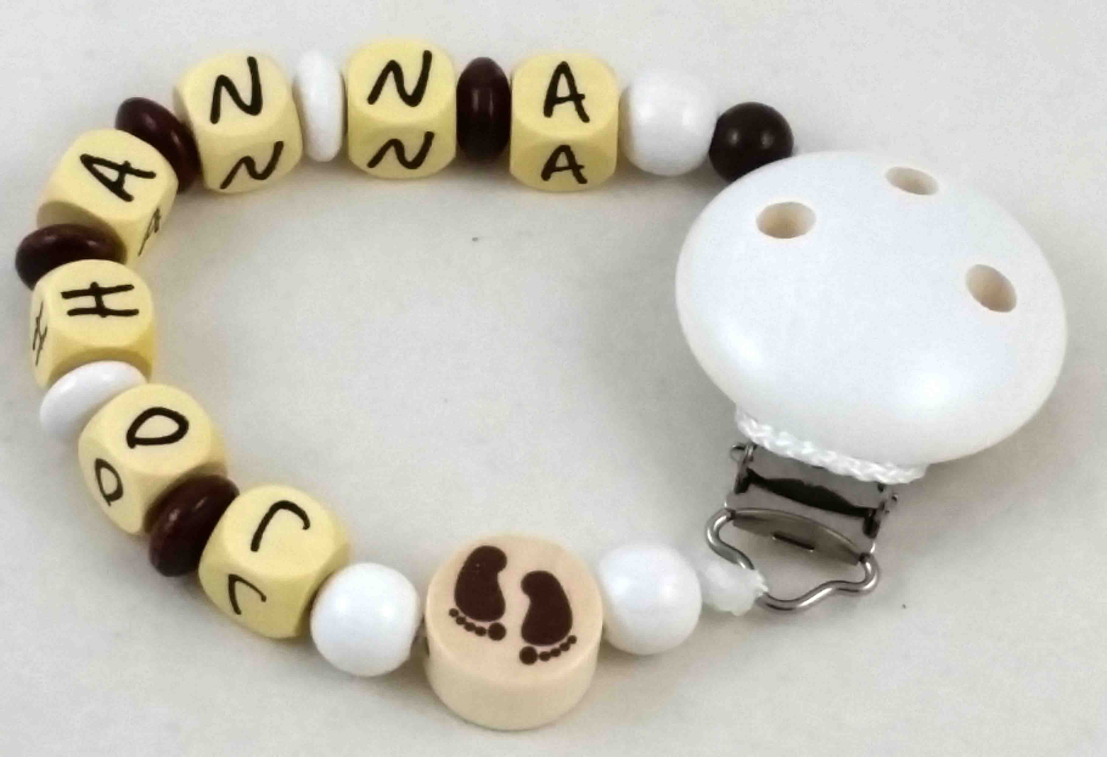 Dieses Schnullerketten-Modell wird in der Farbkombi braun/weiß, einer Motivperle Scheibchen Babyfüßchen und einem unifarbenen Befestigungsclip gefertigt.