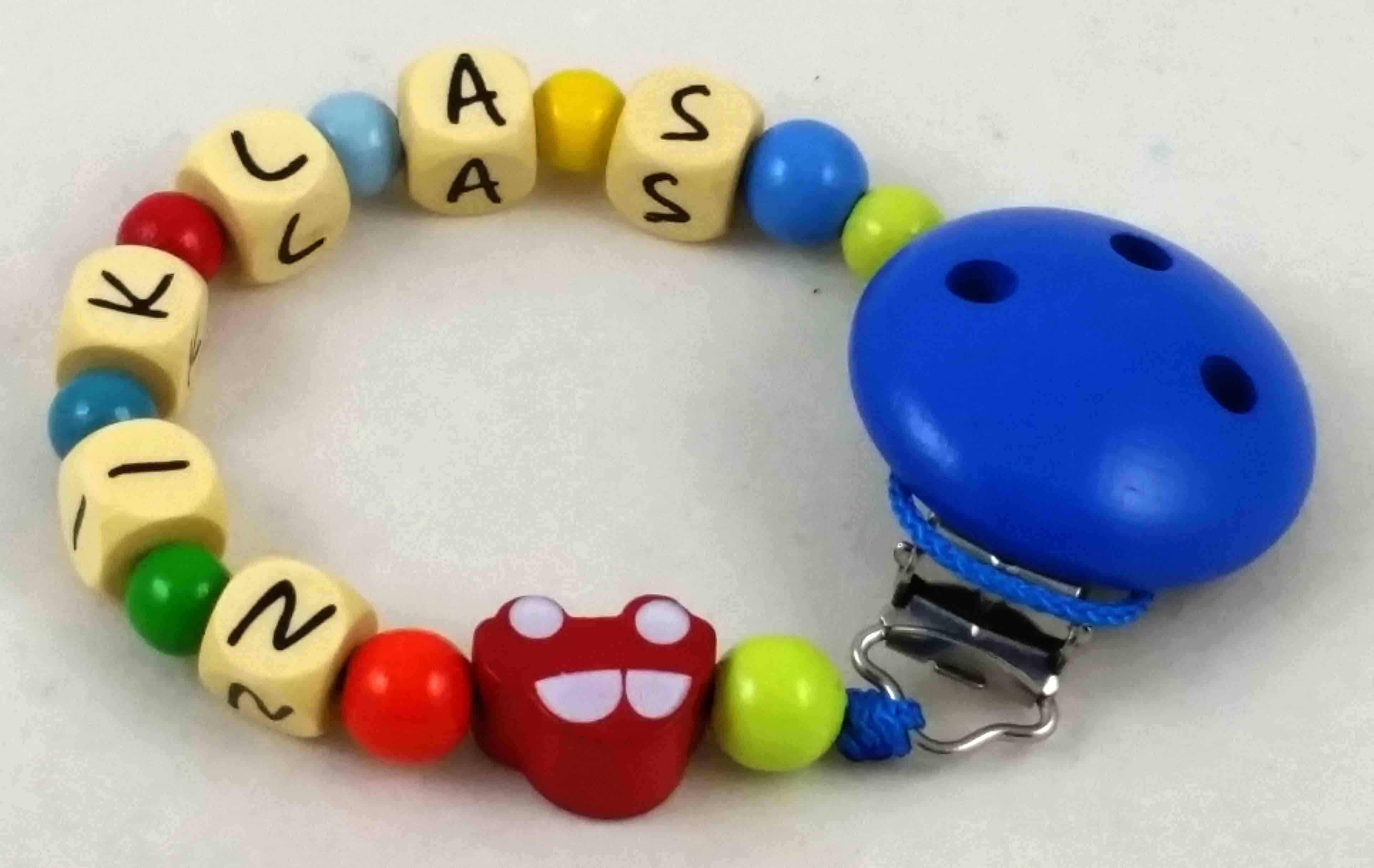 Die abgebildete Schnullerkette besteht aus einer belastbaren PP-Schnur, einem nickelfreien Befestigungsclip aus Holz, geprägten Holzbuchstabenwürfel und Holzperlen bzw. Holzlinsen sowie einer Motivperle aus Holz.