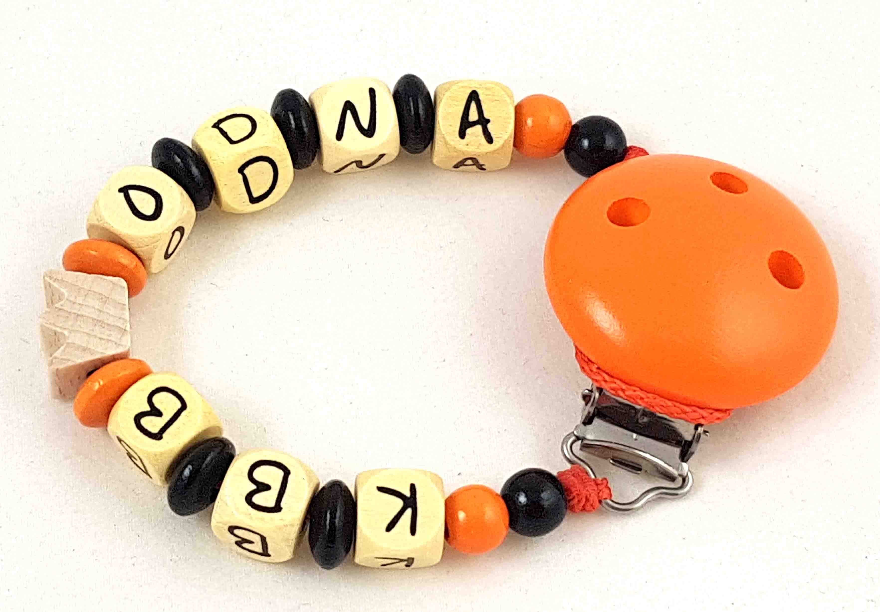 Die abgebildete Schnullerkette besteht aus einer belastbaren PP-Schnur, einem nickelfreien Befestigungsclip aus Holz, geprägten Holzbuchstabenwürfel und Holzperlen bzw. Holzlinsen sowie einer Motivperle aus Holz.