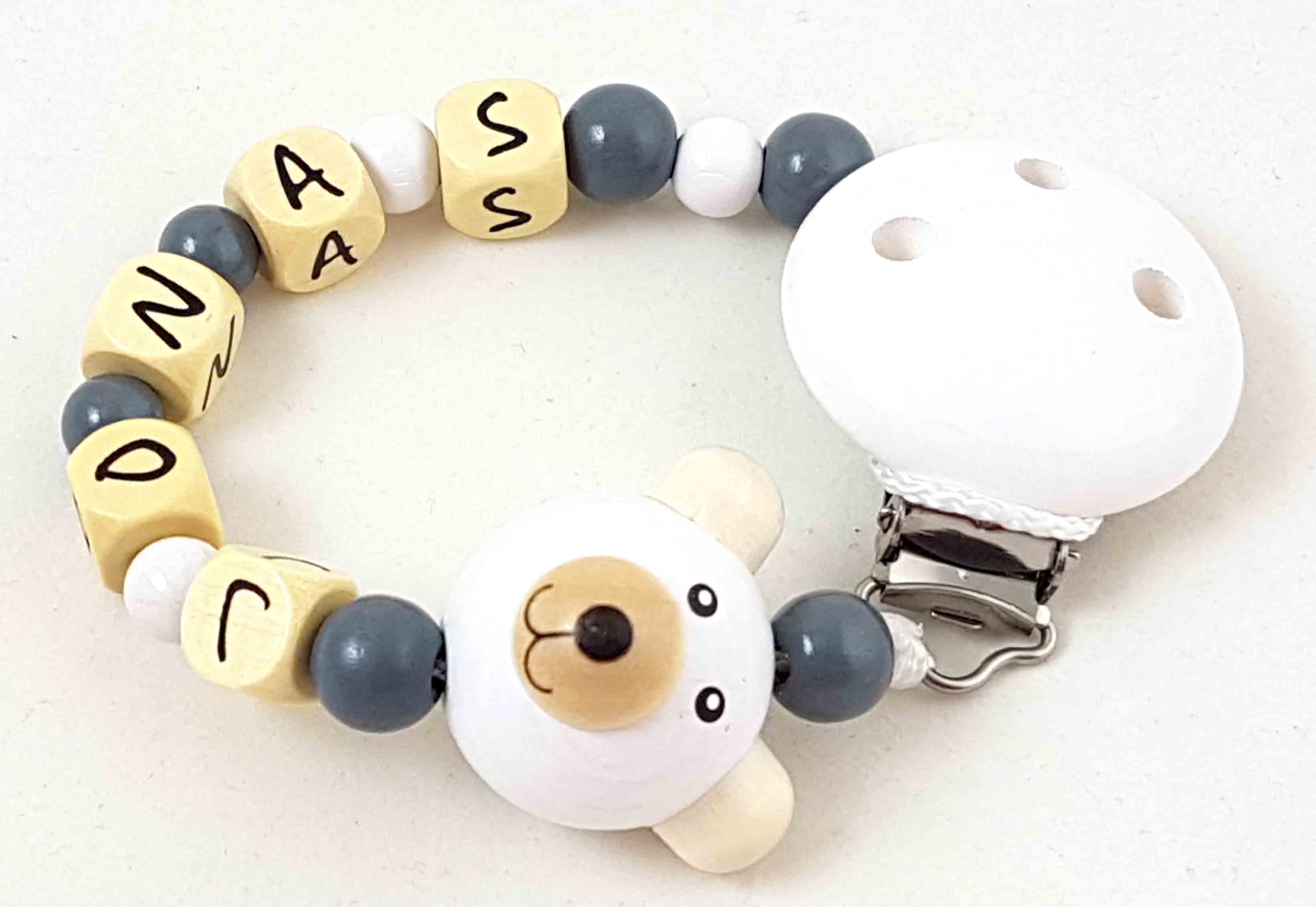 Dieses Modell wird in der Farbkombi grau/weiß, einer Motivperle 3D Bär und einem unifarbenen Befestigungsclip gefertigt.