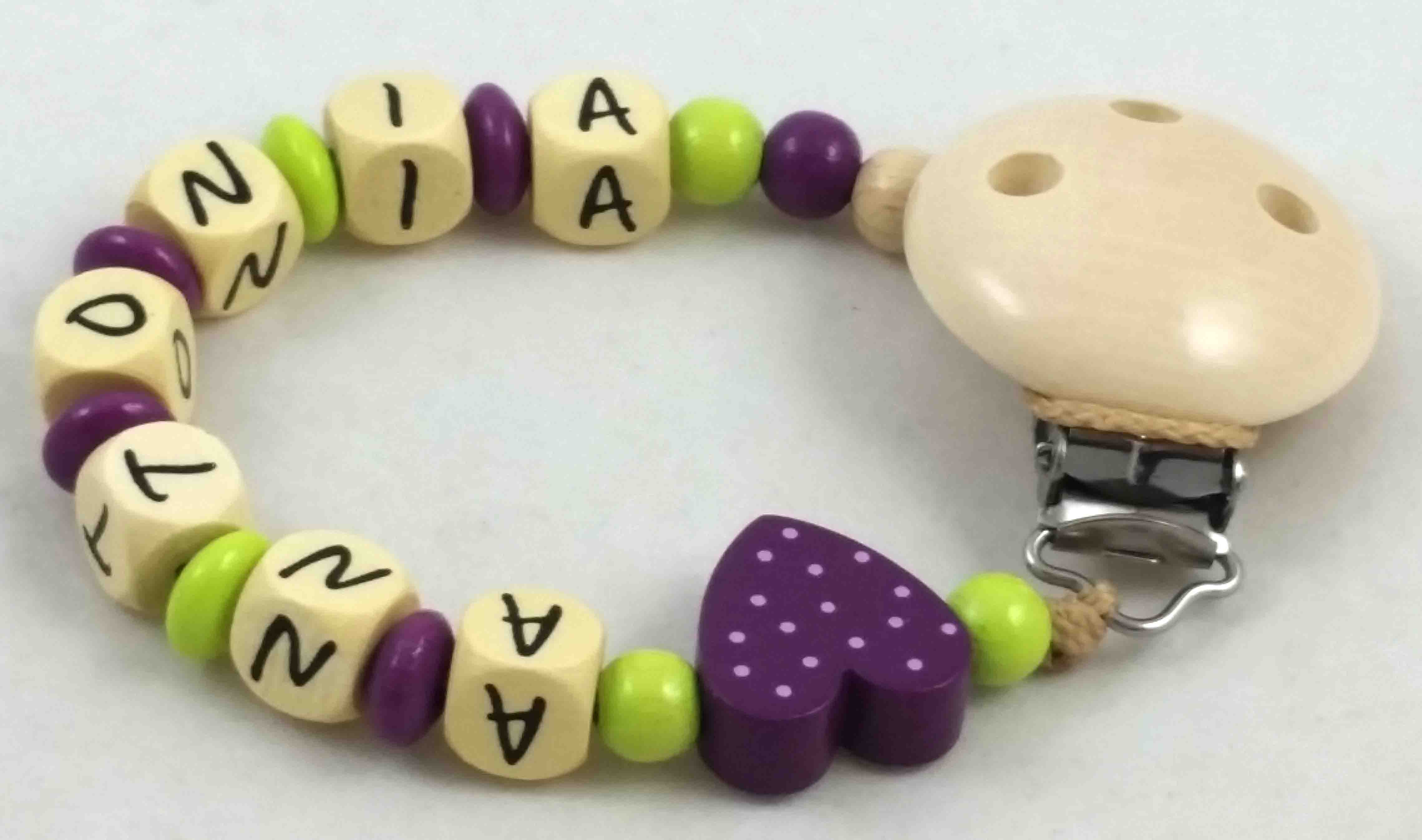 Schnullerkette lemon/pflaume mit Fädelmotiv Herz pflaume gepunktet und Clip natur