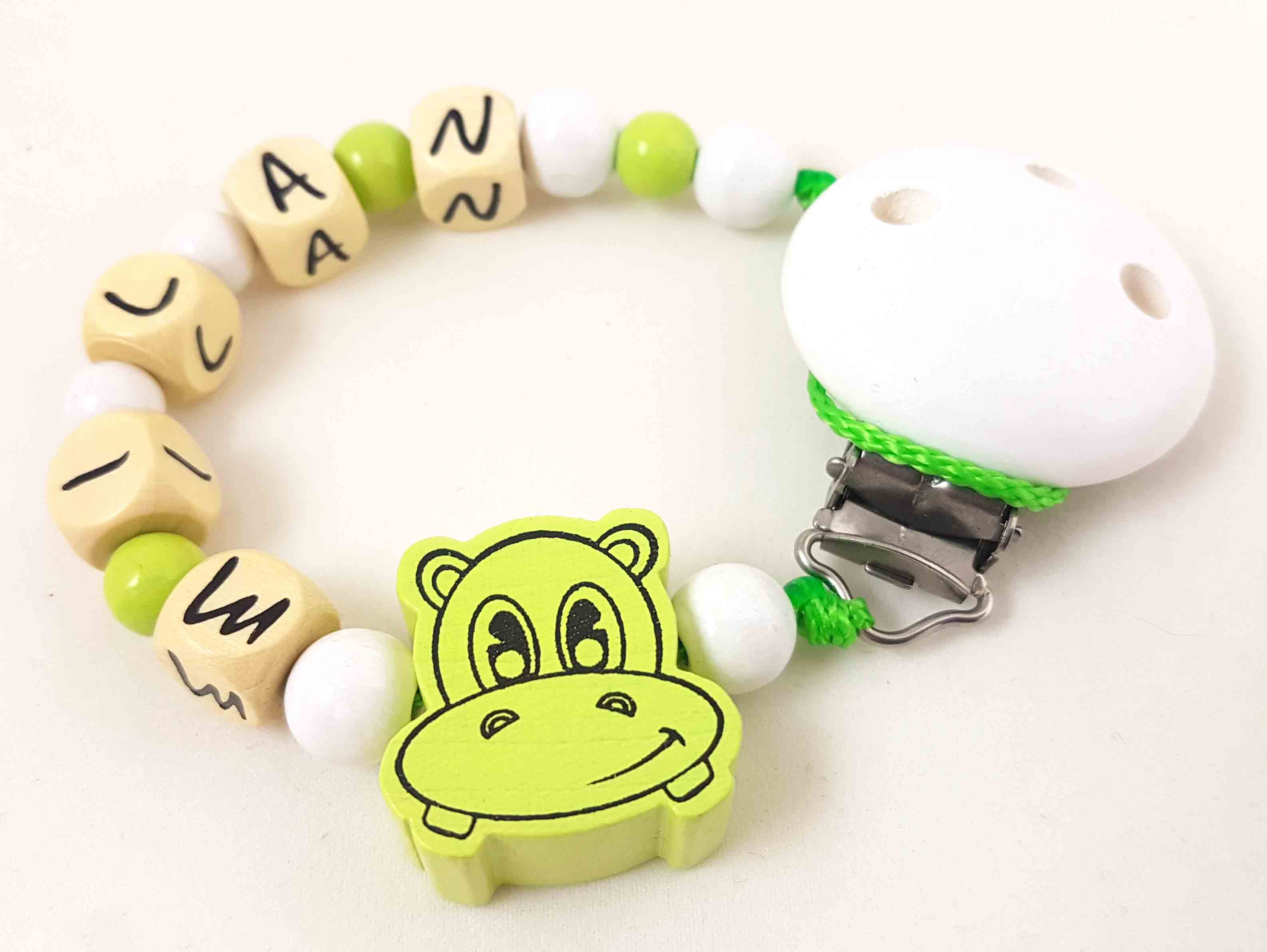 Schnullerkette mit Name "Hippo" in lemon/weiß
