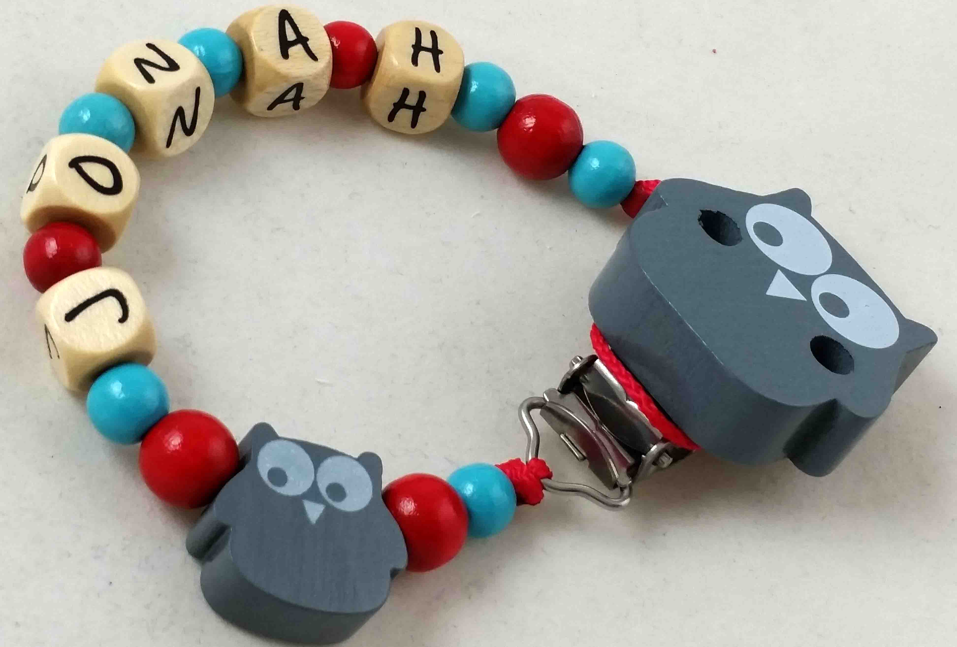 Schnullerkette mit Name "Eule" in mint/rot
