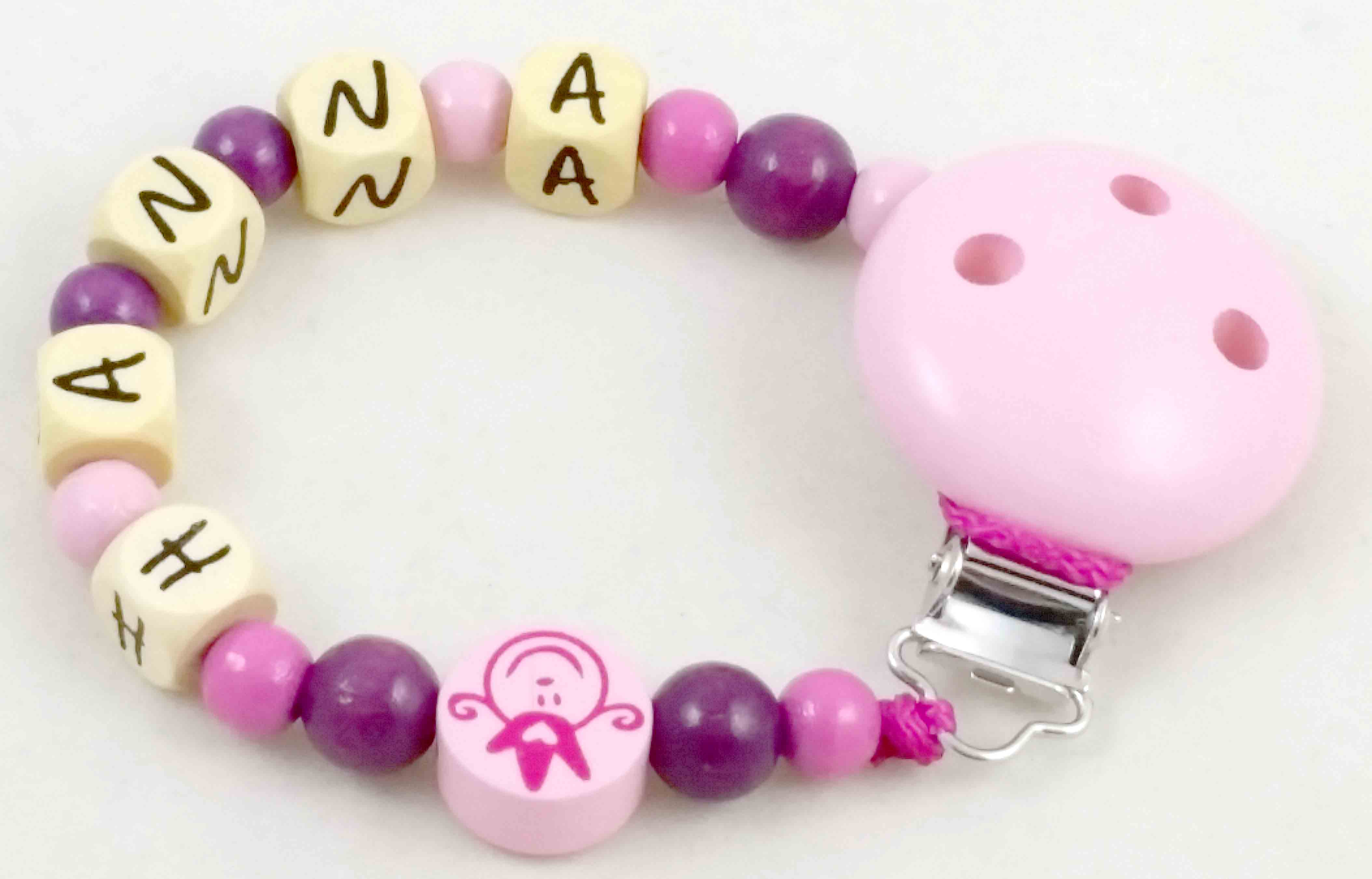 Die abgebildete Schnullerkette besteht aus einer belastbaren PP-Schnur, einem nickelfreien Befestigungsclip aus Holz, geprägten Holzbuchstabenwürfel und Holzperlen bzw. Holzlinsen sowie einer Motivperle aus Holz.