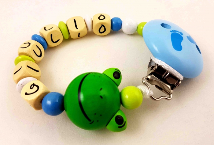 Handgefertigte personalisierte Schnullerkette mit Namen der Serie "Frosch".