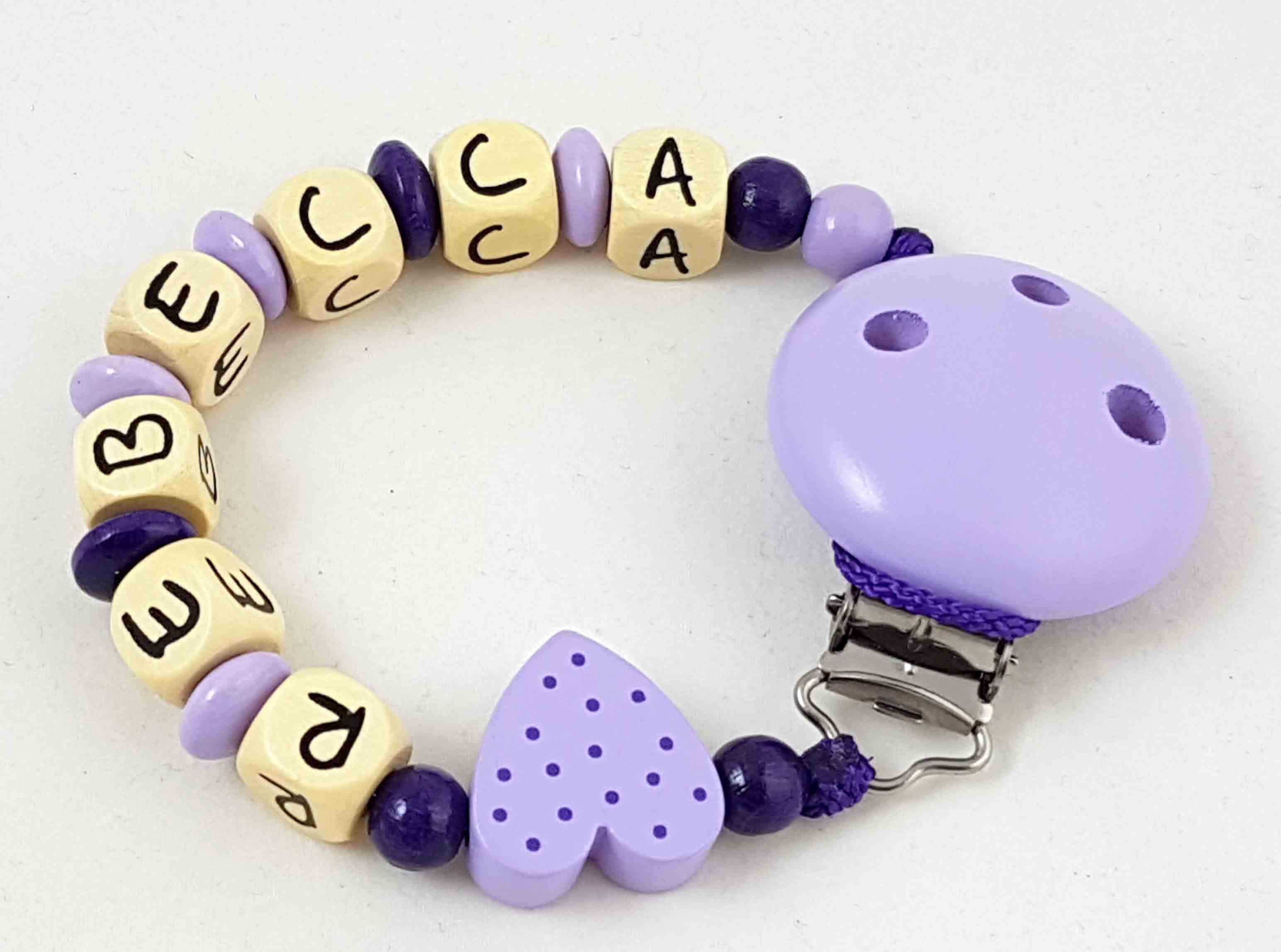 Schnullerkette mit Namen "Tupfenherz" in flieder/dunkellila